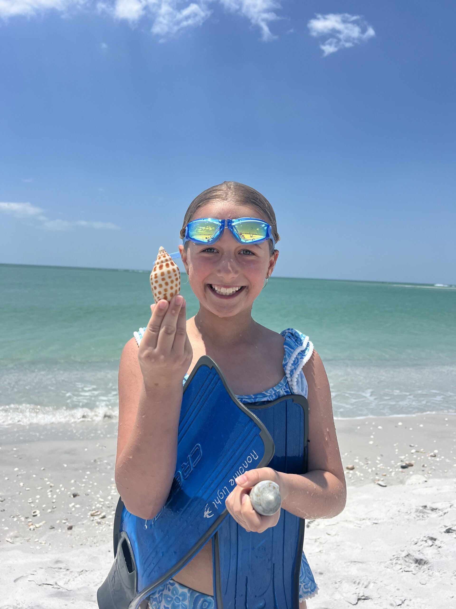 Madeline Robbins, age 10, of Milwaukee, Wisconsin found a rare Junonia shell while swimming on the North end of the Island…