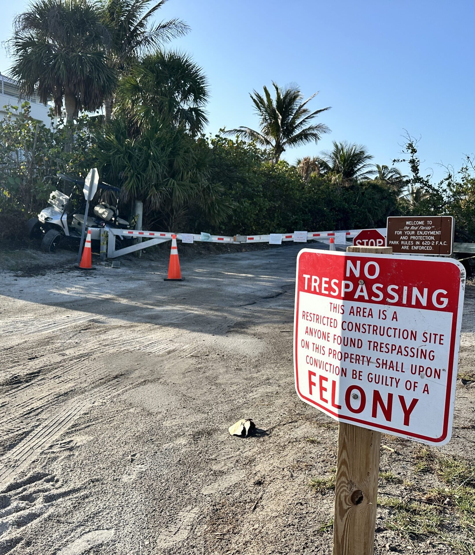 A golf cart got stuck as it attempted to exit the closed construction site at Gasparilla Island State Park. The cart was se…