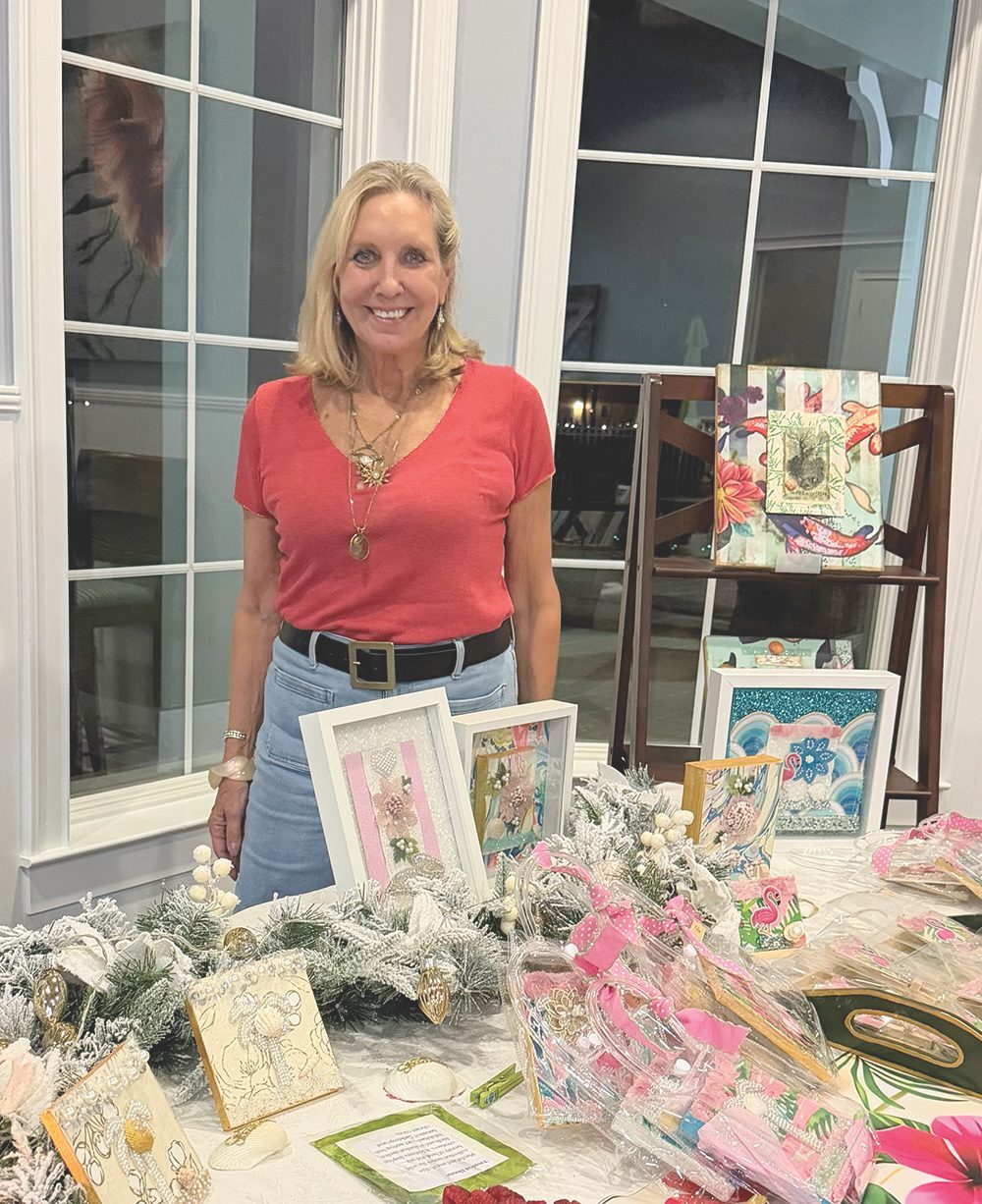 Local artist Dawn Barry-Bryan introduced her art collection last week at The Hammocks Cape Haze. Dawn’s pieces are mixed-media collages that blend seashells, textiles, beads and vintage illustrations into layered, tactile works of art that celebrate the charm of coastal living. Photo by Miryam