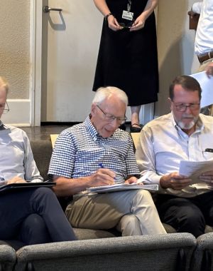 Above, from left: Richard Ganong, Bruce Kenan and Mark Spurgeon study papers before the beginning of the meeting; each group was seated in order by the member of the Lee Commission who appointed the…