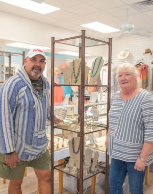 Manny Sanchez & Barbara Anne Plante (left) are standing in the renovated Barbara Anne’s Jewelry & Repair. Jennifer Gulli, Debbie DiTomo and Dina Beaumont of Sunsets of Boca Grande stand in f…