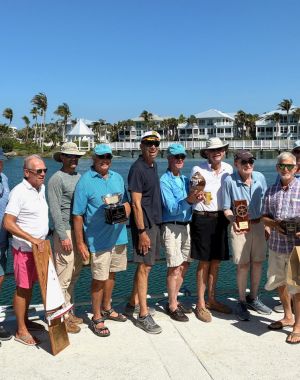 Competitors in the April 6, 2025 BSYC “Island Championship” are (L to R): Mark Rickenbaugh, Oakley Johnson, Lee Edwards, Nat Leonard, Steve Brink, Sam Howe – Commodore, Bill Ewing, Tom Wilcox, H…
