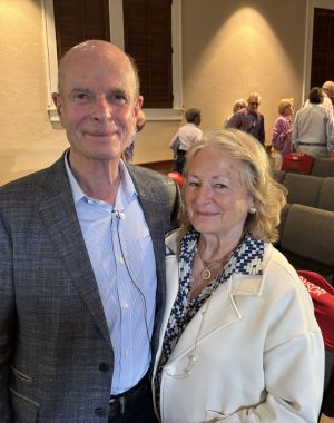 Above, Sir John Scarlett with his wife, Gwenda, after the talk at the Boca Grande Community Center. Photo by Garland