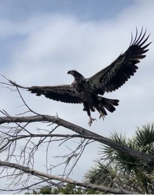Juvenile bald eaglet entertains at Boca Grande railroad trestles