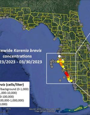 Over the past week, the red tide organism Karenia brevis was detected in 75 samples collected from Florida’s Gulf Coast. Bloom concentrations (>100,000 cells/liter) were present in 14 samples from S…