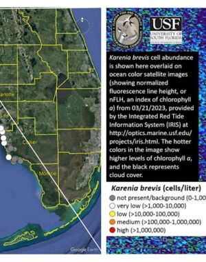 Over the past week, the red tide organism Karenia brevis was detected in 72 samples along Florida’s Gulf Coast. Bloom concentrations (>100,000 cells/liter) were present in nine samples: six in Pinel…