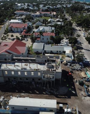 An aerial view of the construction of the future Boca Grande Health Clinic, looking south, taken Thursday morning. The building, replacing a storm damaged Annex, is part of their Clinic of the Futur…