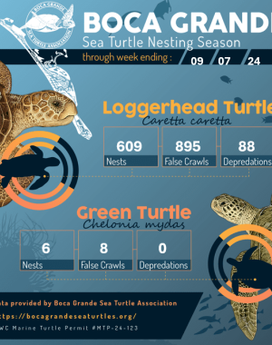 As of September 7, the Boca Grande Sea Turtle Association’s (BGSTA) “completion countdown” is at 25 nests. 21 of those are loggerhead nests and four are green turt…