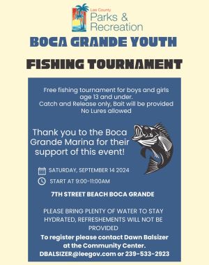 A youth fishing tournament will be held at the 7th Street Beach Access due to the temporary closure of the Boca Grande Fishing Pier. It will run from 9 a.m. to 11 a.m. on Saturday, Sept. 14. Tournam…