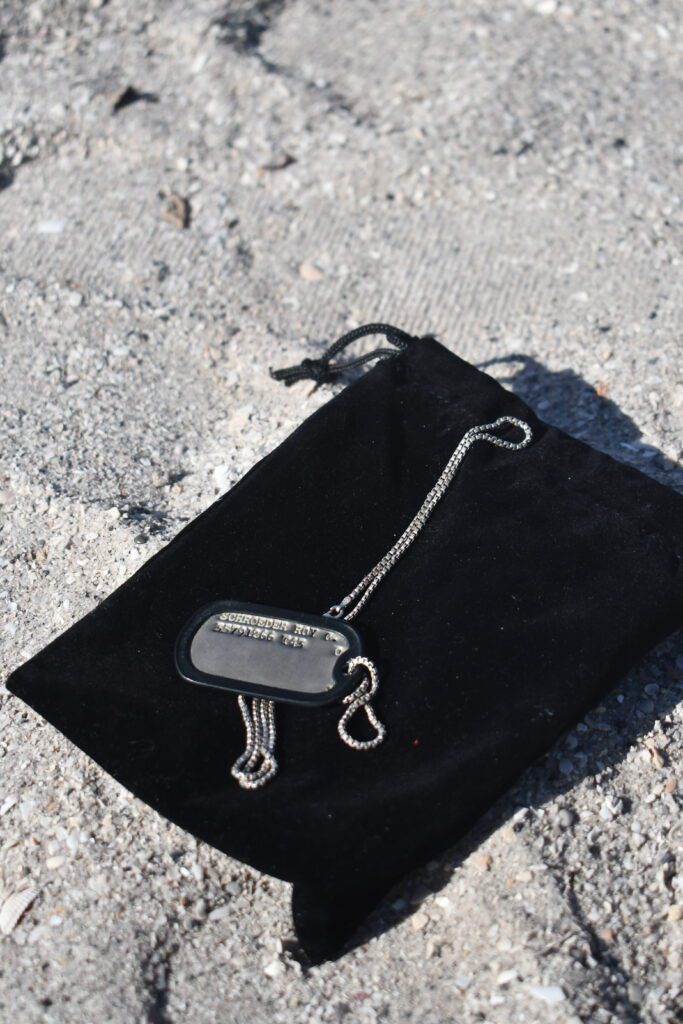 In July 2024, Marie-Laure Laffaire was visiting Gasparilla Island from Paris, France. For years, she and her three children always went to 13th Street to swim ever since her grandfather, a great sailor, lived near Boca Grande. That summer, she was snorkeling when she came across a silver chain attached to an ovular identification tag with a black rubber bumper. The tag was stamped with the name, “SCHROEDER ROY C.,” above the numbers 35791266 T43.