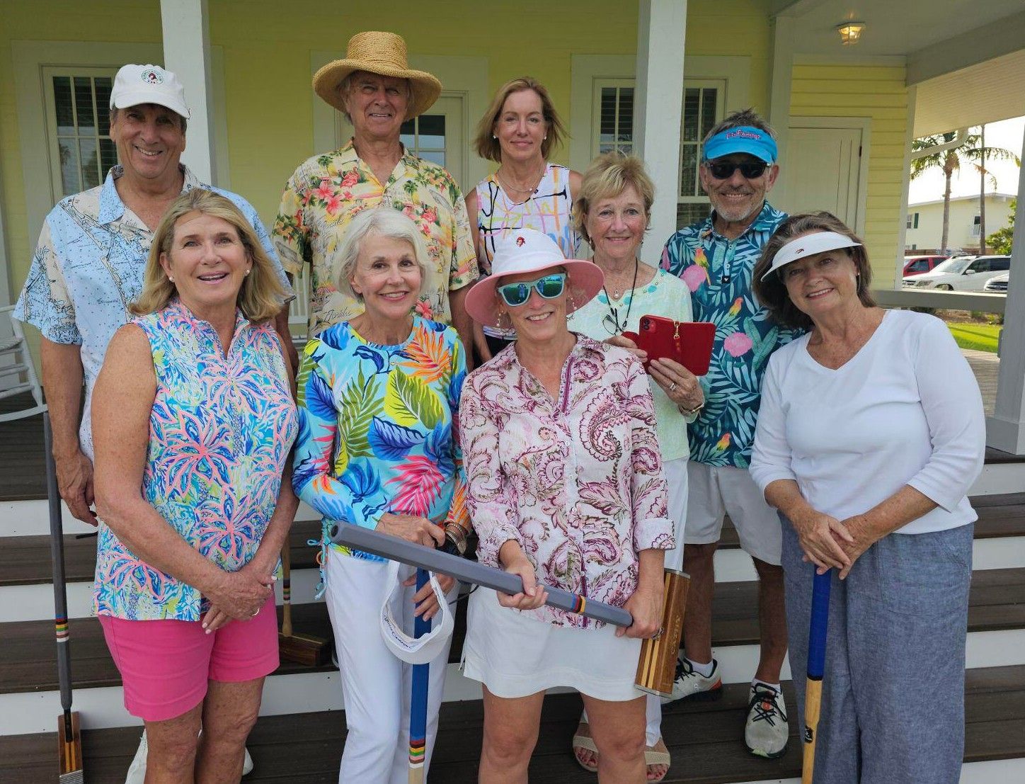 Gasparilla Mallet Club Celebrated National Croquet Day. Although most of the members of the Gasparilla Mallet Club already headed for summer pastures, they still had a few players assemble to celebrate National Croquet Day. They brightened the day by dropping the traditional “white” attire in favor of some flash. They enjoyed a golf croquet competition followed by dinner at Sisters. Made for a great day! Pictured front row, l to r, Donna Welsh, Karen Kovach, Cathy Russo, Virginia Williamson; back row, Ted Welsh, Gap Kovach, Lucy Rose, Yvonne Anderson and Skip Russo.