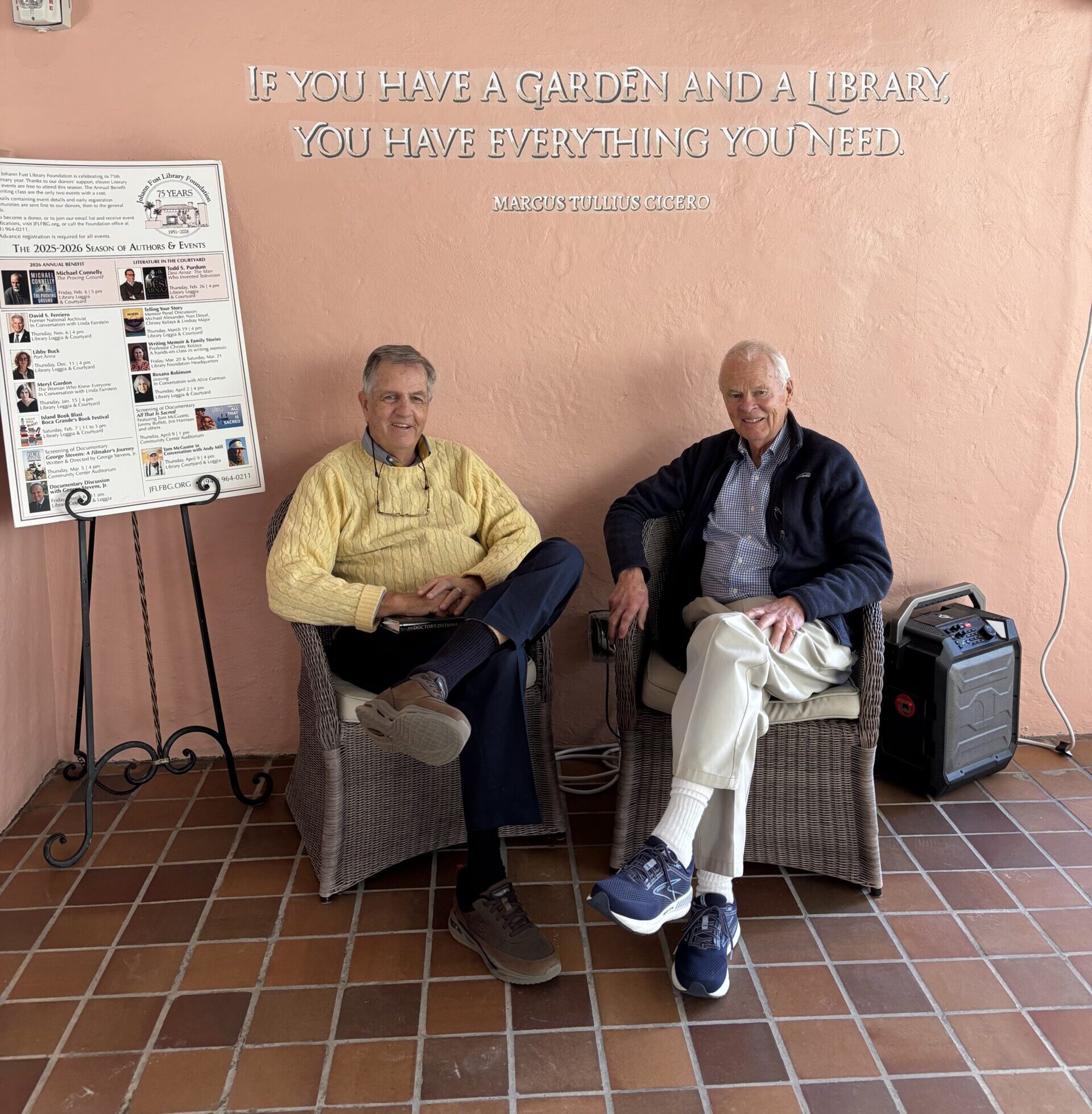 At the Saturday Island Book Blast, above, Brit Hume and Michael Alexander; below left, Candice Shy Hooper, Linda Fairstein and Cappy Powell speak to Barbara Edgerton. Right, Judy and Michael Alexander with songwriter and poet David Parker Allen. Photos contributed