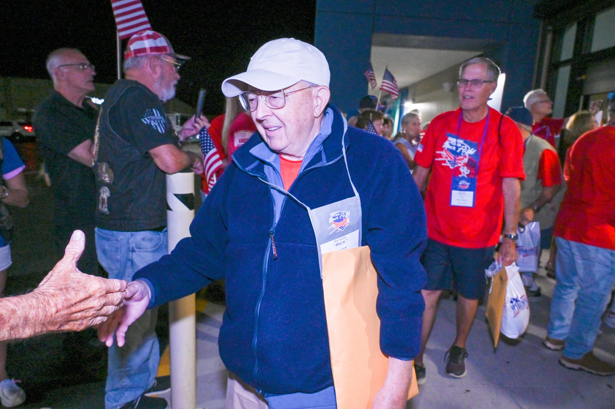 Rick Hugger arrives in Punta Gorda when the Southwest Florida Honor Flight returned home on Tuesday from their Mission XX with 99 veterans including four WWII, 10 Korean and 62 Vietnam era vets.                        Photo by Caroline