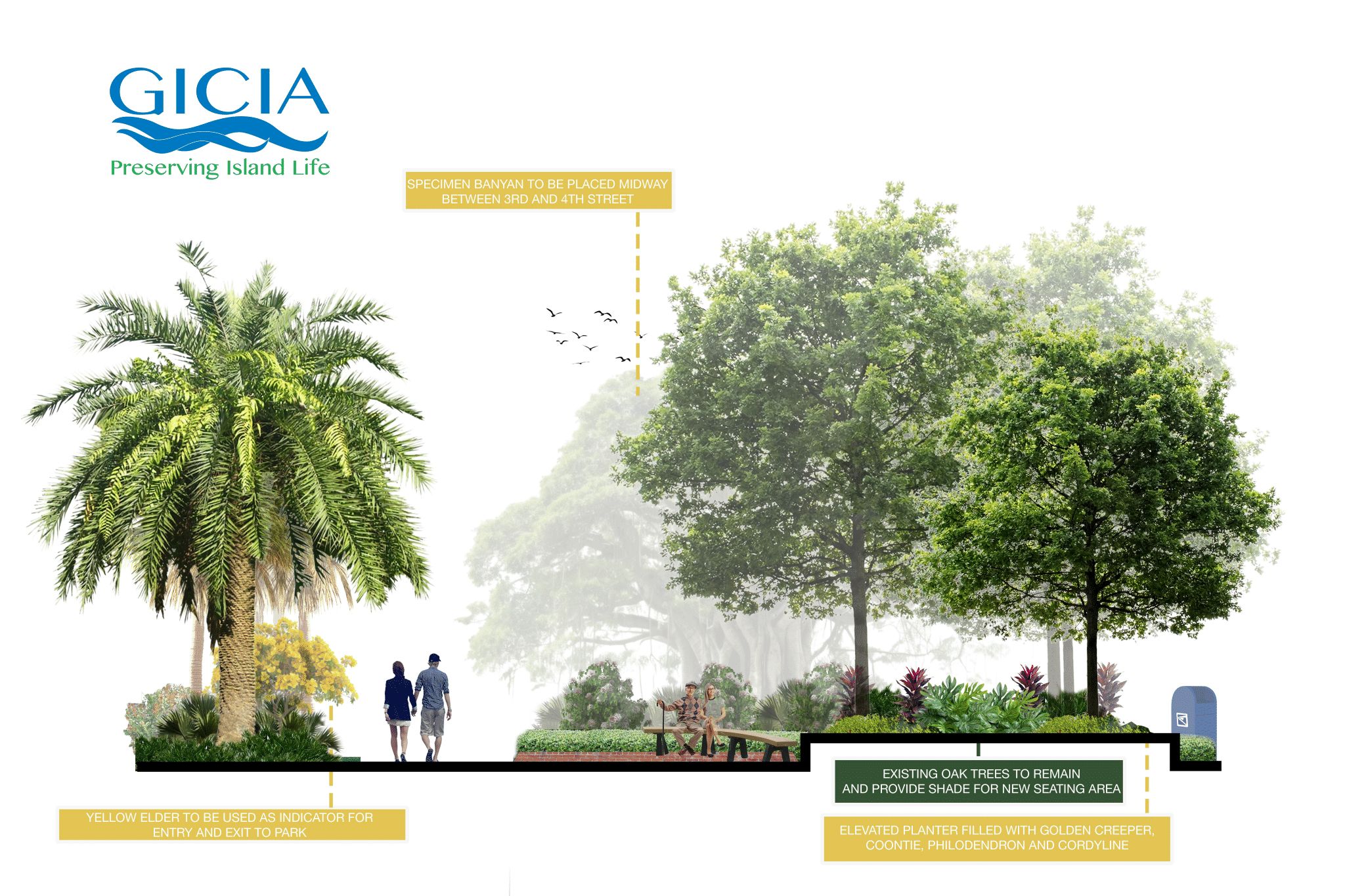 The Town Park is a highly visible and extensively used section of the Bike Path in the heart of Boca Grande. This restoration is an opportunity to create a true park feel while enhancing safety, creating a park-like setting with attractive and shaded seating areas, and improving the vehicle and cart parking areas that are so important to the downtown area. In keeping with the Bike Path Master Landscape Plan, native, salt- and drought-tolerant grasses, shrubs, and trees will be used.